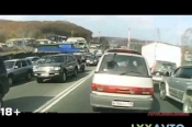В представленном видео присутствуют возражения водителя в ненормативной лексике, поэтому слишком впечатлительным не следует смотреть его. Видео короткое и чтобы понять, в чем дело, нужно внимательно наблюдать за каждым маневром черного джипа.